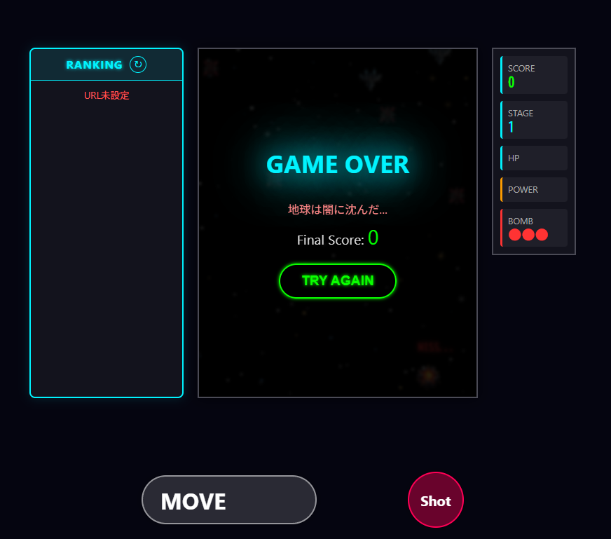 スマホの横幅に対して、SCORE・STAGE・HP・POWER・BOMB・RANKINGの6要素が1行に収まらず、右端が見切れてしまう問題もありました。こちらはCSSで各ステータス項目をwidth: 33.3%の2行×3列グリッドに変更し、RANKINGボタンは「🏆 RANK」と短縮して2行表示にすることで解決しました。